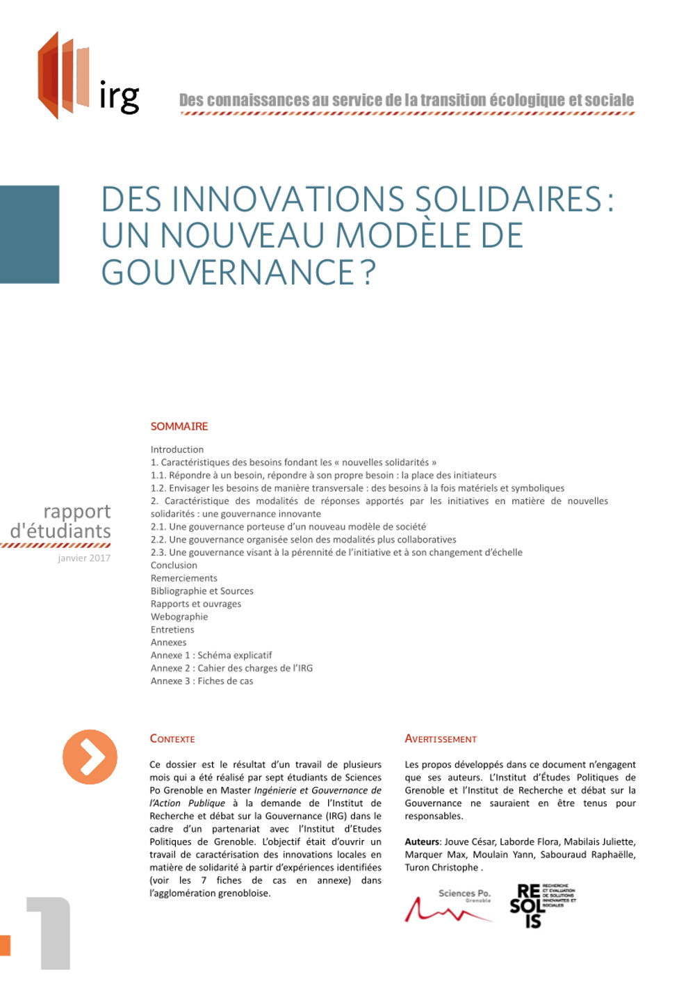Ce dossier est le résultat d’un travail de plusieurs mois qui a été réalisé par sept étudiants de Sciences Po Grenoble en master Ingénierie et Gouvernance de l’Action Publique à la demande de l’Institut de Recherche et débat sur la Gouvernance (IRG) dans le cadre d’un partenariat avec l’Institut d’Etudes Politiques de Grenoble. L’objectif était d’ouvrir un travail de caractérisation des innovations locales en matière de solidarité à partir d’expériences identifiées (voir les 7 fiches de cas en annexe) dans l’agglomération grenobloise.