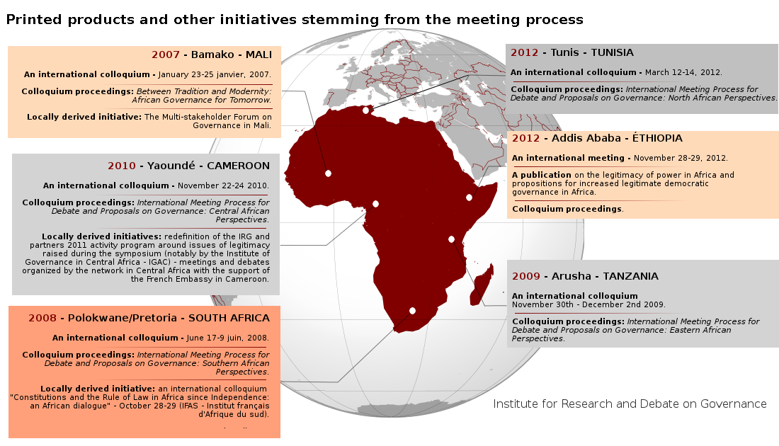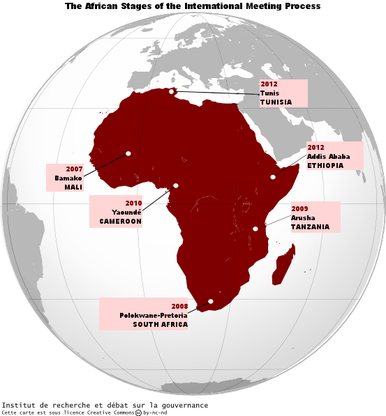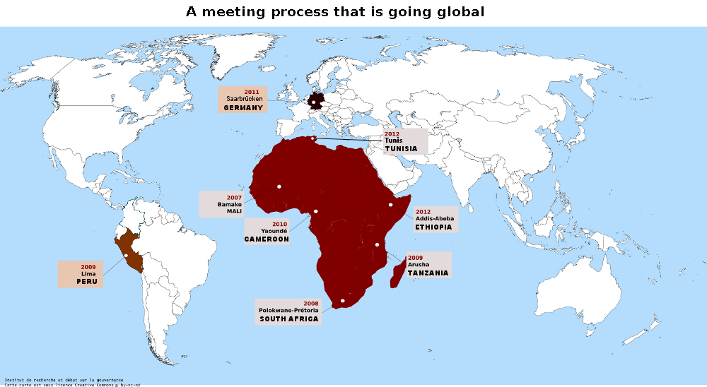 Initiated in 2007 in Bamako (Mali), the meeting process then proceeded to explore the African continent, thus resulting in the international meetings of Polokwane and Pretoria(South Africa) in 2008, Arusha (Tanzania) in 2009, Yaoundé (Cameroon) in 2010, and Tunis (Tunisia) in 2012. The process also expanded out of Africa and to date has included events in Lima (Peru) in 2009 and Saarbrücken (Germany) in 2011. It will lead us, at the end of November 2012, to Addis Ababa (Ethiopia).
