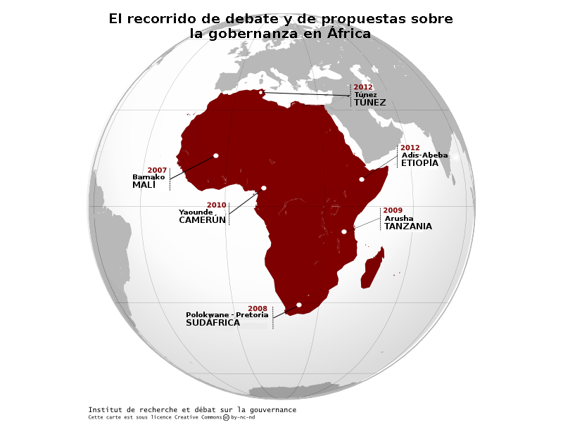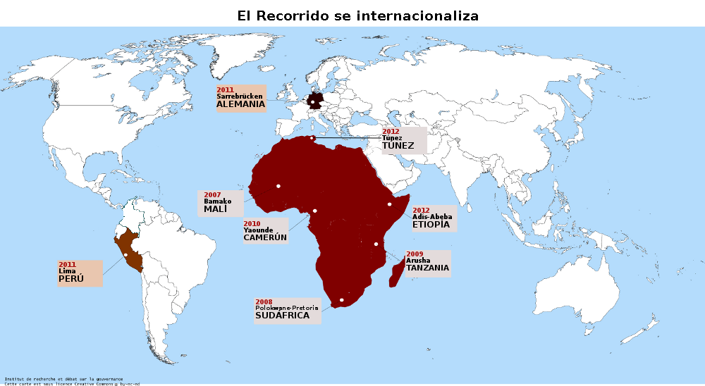 Iniciado en 2007 en Bamako (Malí), el Recorrido luego recorrió África con encuentros en Polokwane-Pretoria (Sudáfrica) en 2008, en Arusha (Tanzania) en 2009, en Yaoundé (Camerún) en 2010 y en Túnez (Túnez) en el año 2012. También se internacionalizó con encuentros en Lima (Perú) en 2009 y Saarbrücken (Alemania) en 2011. Nos guió en Adís Ababa (Etiopía) a finales de noviembre de 2012.